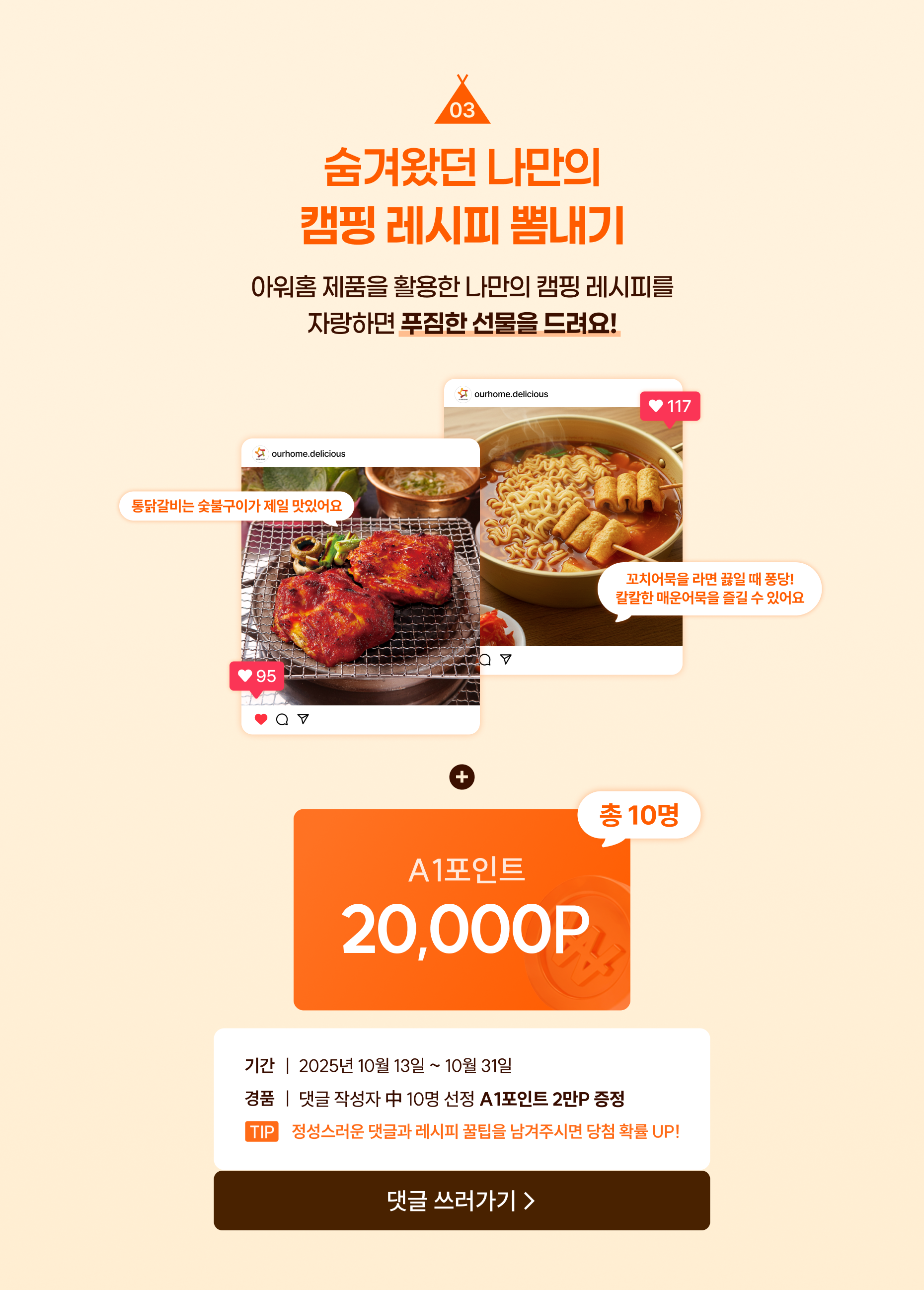 아워홈 제품을 활용한 나만의 캠핑 레시피를 자랑하면 푸짐한 선물을 드려요!